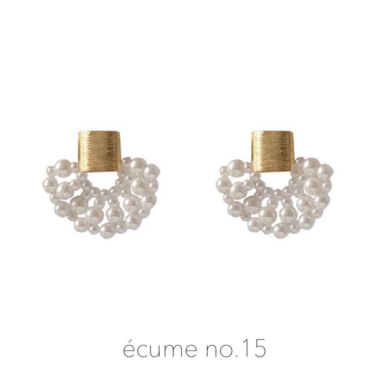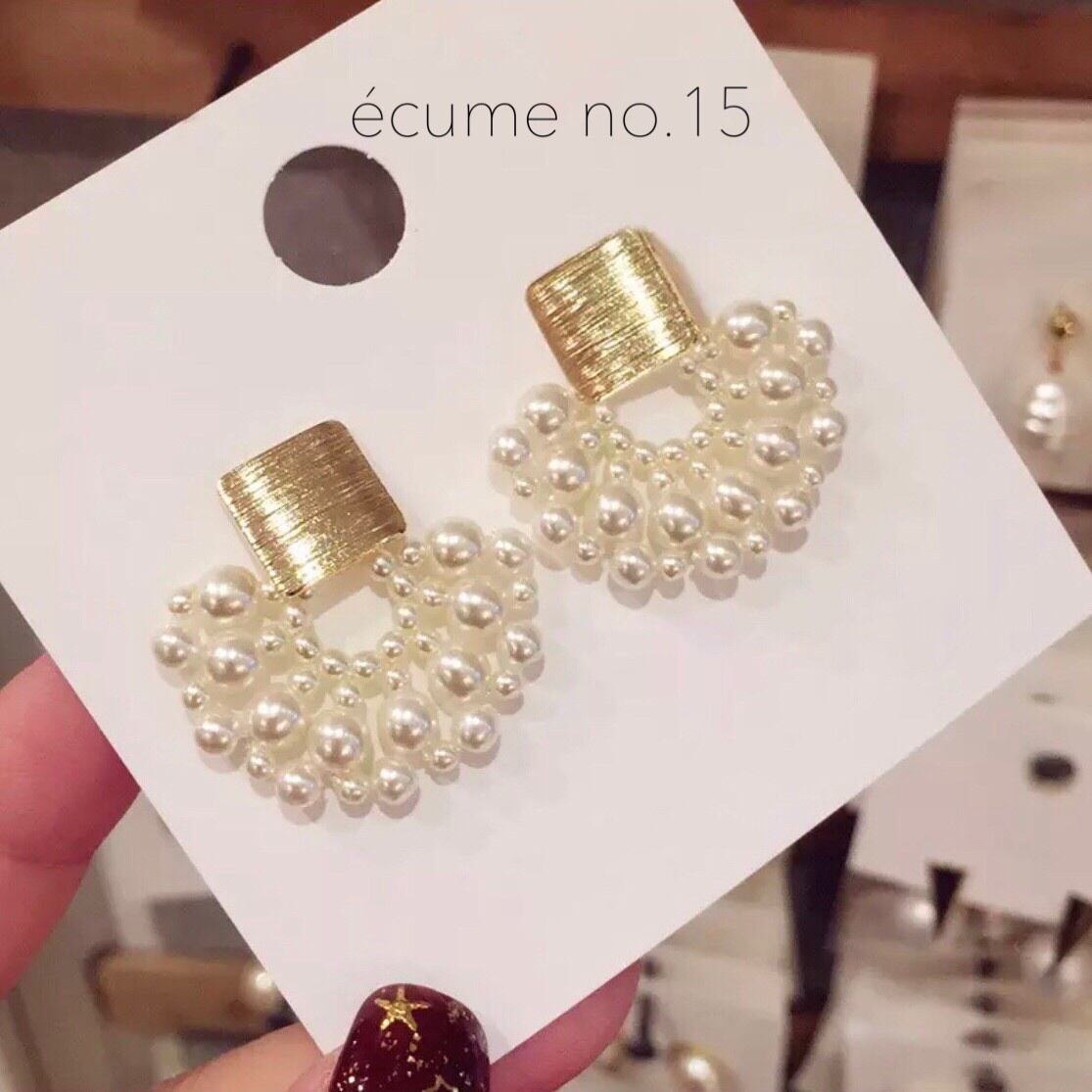四角いゴールドのチャームに、扇形に広がったパールが合わさったゴージャスなピアスです。大ぶりなので存在感もバッチリです。
